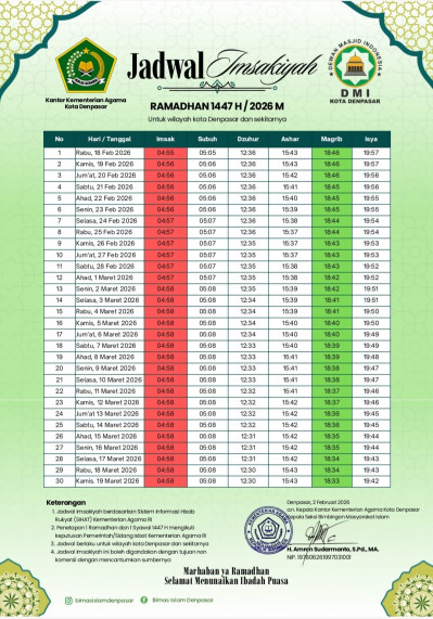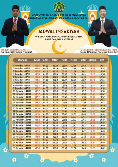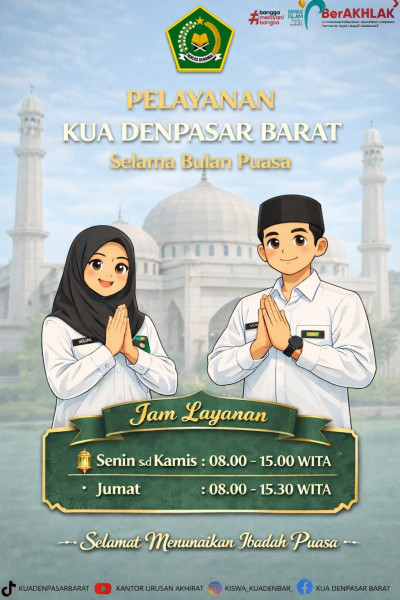 Informasi Jam layanan Kantor Urusan Agama (KUA) di wilayah Denpasar Barat selama bulan Ramadan Tahun 2026 berdasarkan Peraturan Presiden Nomor 21 Tahun 2023 tentang Hari Kerja dan Jam Kerja Instansi Pemerintah dan Pegawai Aparatur Sipil Negara.